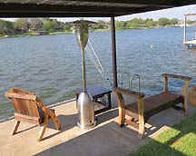 This waterfront lake house is on open water of the Llano Arm of normally constant level Lake LBJ in Kingsland, Texas. It has a nice fishing/swimming pier where you can tie up a boat and jet ski.